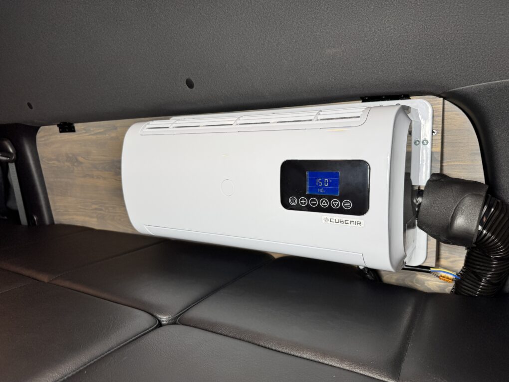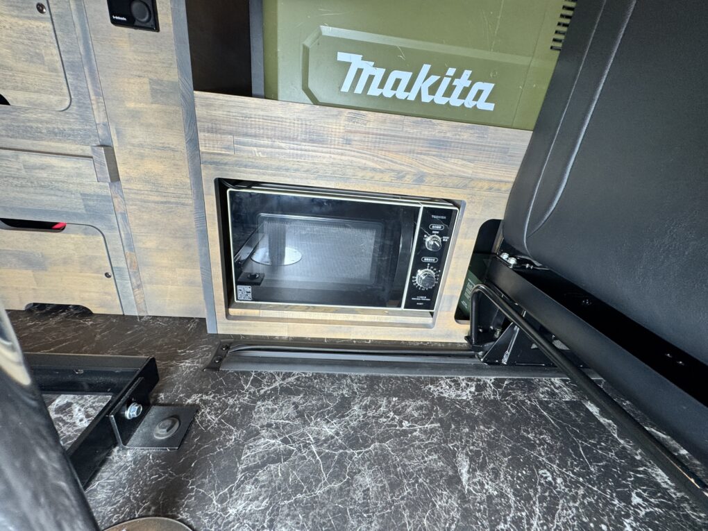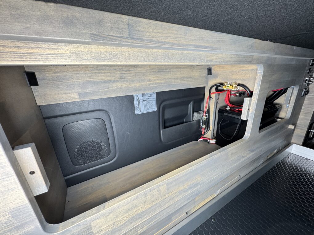 車内は高さのある機材を積むため、床から700mmの高さのベッドに。