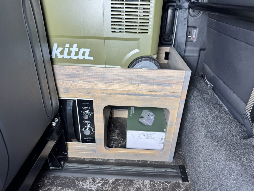 ワイドボディですが、敢えてナローサイズのフロアーを付け両サイドの収納スペースを確保しました。